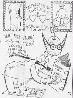 En varios dibujos se tocó también el otro tema sobre el que pesaron las críticas al gobierno peronista: la falta de libertad de pensamiento, en especial en el ámbito universitario. En efecto, en «Alpargatas sí, libros no» Tristán alude nuevamente a una categorización ideológica del régimen, utilizando el recurso de las inscripciones y de determinadas referencias dibujadas. Por ejemplo, el personaje semi-humano, con orejas de burro y lentes con esvásticas, que hojea un manual de doctrina peronista, pisoteando la ley; los retratos de Perón y Evita (el primero esquematizado en algo parecido a una boca de pato, y la segunda con atuendos de reina).